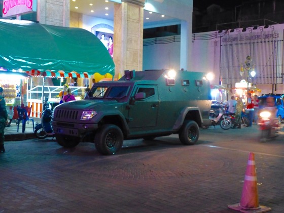 夜食事を終えてホテルに帰ると、ホテルの真下に軍隊の装甲車?